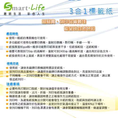 Smart-Life 3合1白色標籤紙 A4 100張 5X12(60格) 優惠賣家